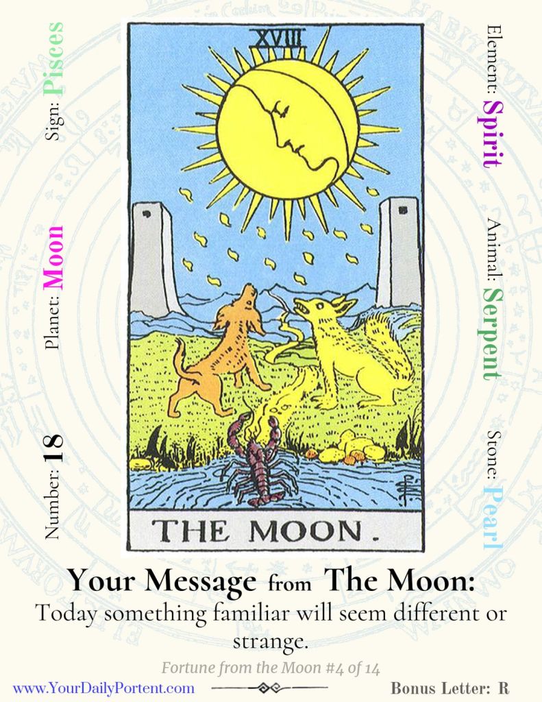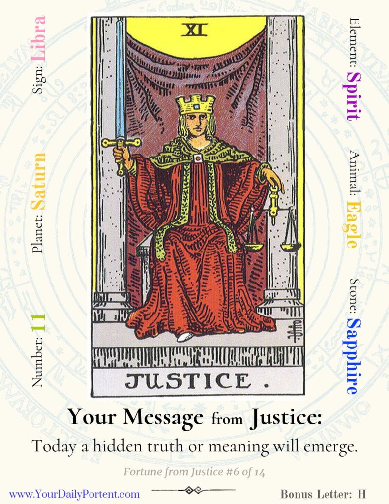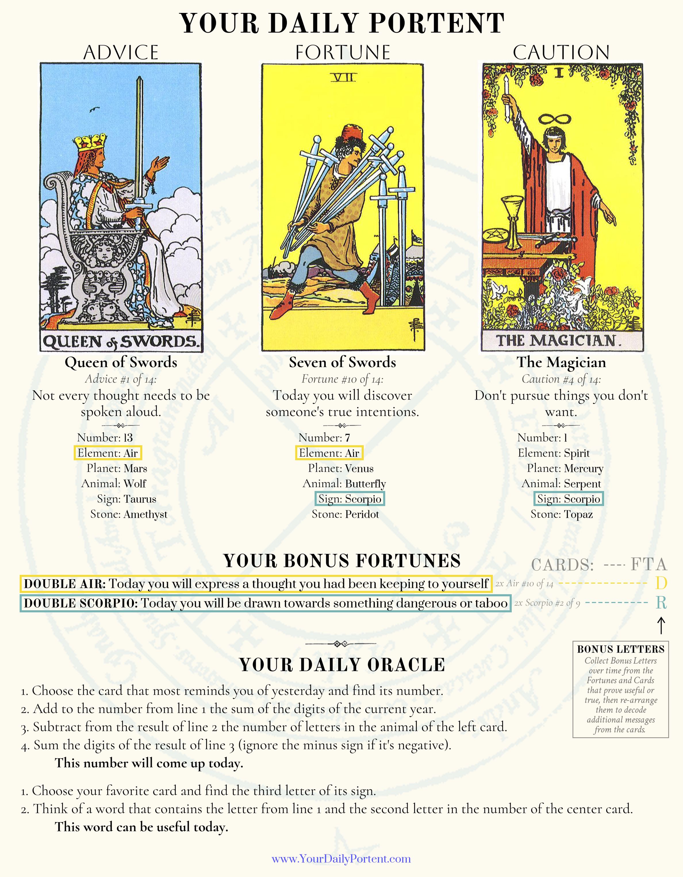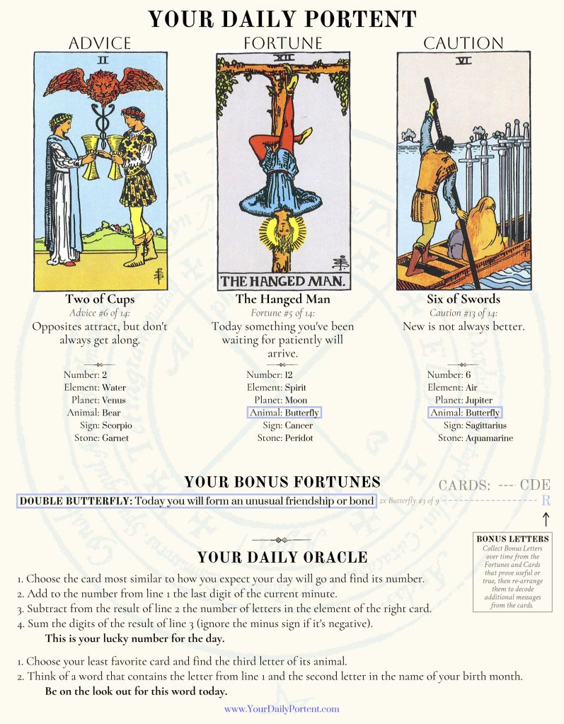 Sign up for Your Daily Portent to get a 3-Card Tarot Reading sent to your inbox every morning – or Your Daily Draw, a 1-Card Draw with a random message from that card’s point of view.